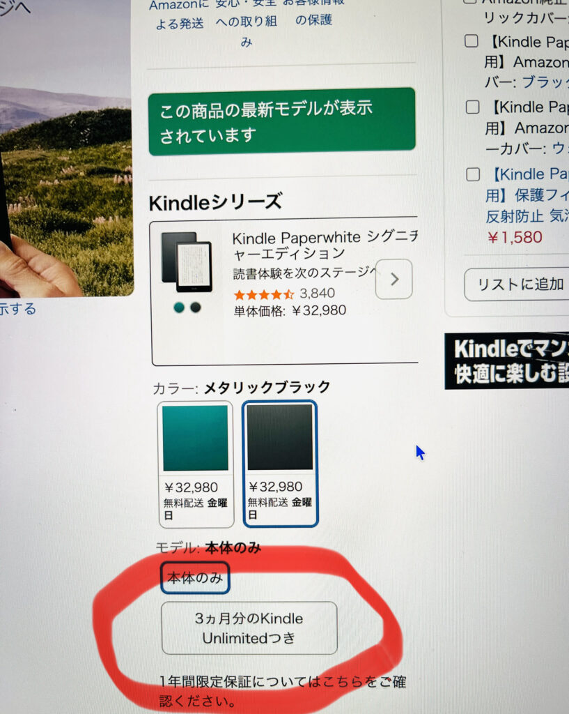 - 端末購入時に「Kindle Unlimited 3ヶ月無料」オプションを付けると約3,000円追加でお得