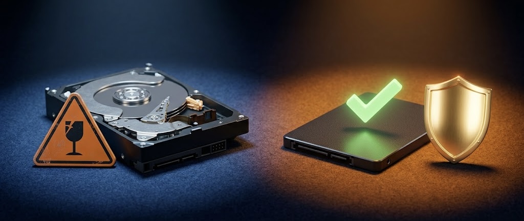 SSDはソリッドステートドライブの略です。フラッシュメモリにデータを記録するため振動や衝撃でも壊れにくい構造です。HDDは内部にディスクが回転する駆動部品があるため、落下・振動で壊れるリスクが高くなります。